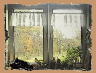 Holz zu schnitzen und das ist uns auch recht gut gelungen... Wenn man das Bild sozusagen nach rechts verlängern könnte, dann würdet ihr eine große freie Wiesenfläche sehen: Da soll mal der zukünftige Teich hin. So, das war's erstmal... im nächsten Sommer gibt es sicher neue Photos, dann zeig ich euch, wie es aussieht, wenn alles grün ist & blüht. Sophie liegt während der ganzen Zeit, in der ich hier tippe, faul auf der Fensterbank in der Küche, wie ihr unten sehen könnt. |